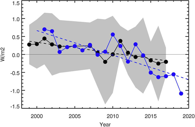 We have a continuing, and significant negative trend. This means that more solar ENERGY enters the Climate System and warms the Earth.