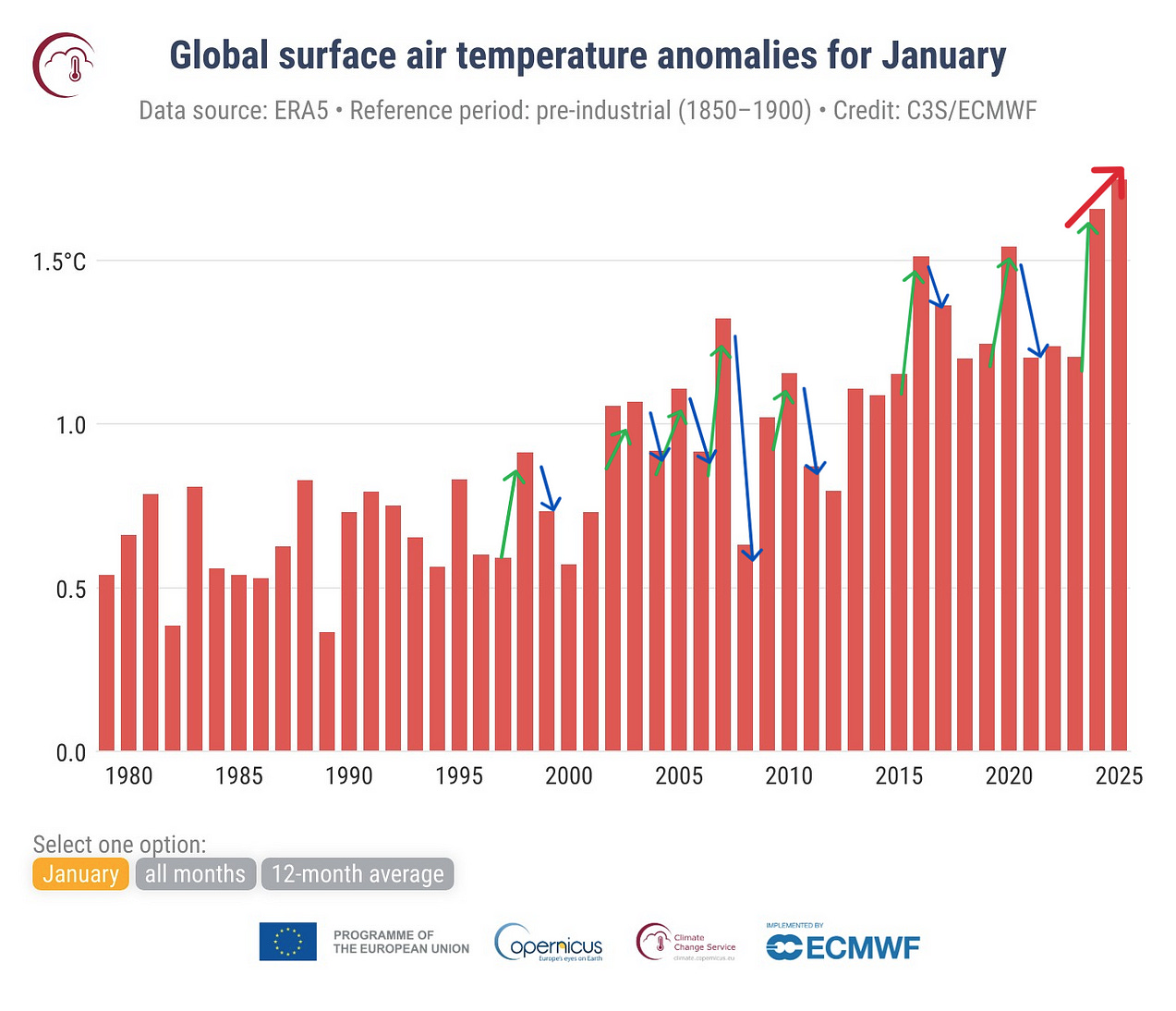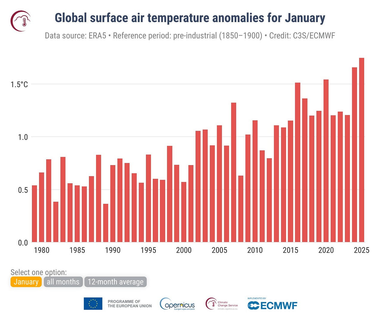 So, if we compare January 2025 against the 1850–1900 GMST average for January. It is +1.75°C over that baseline. Which is what the chart shows.