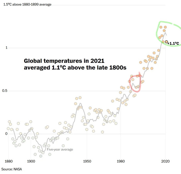 In 2021, the “Observable” Global Mean Temperature (GMT) was 1.1℃ above the 1950–1980 baseline. This happened despite it being a La Niña year in the Pacific Ocean, a weather pattern which tends to cool the planet.