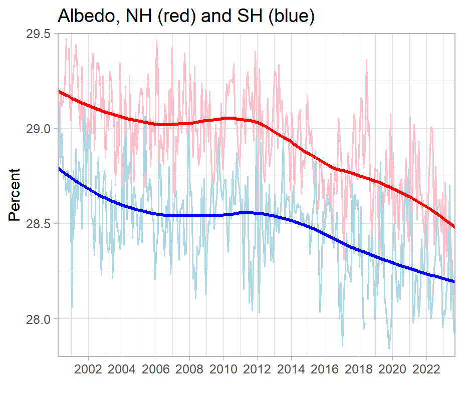 James Hansen has stated that the imbalance due to the albedo dimming is about the same as a +100ppm increase in CO2 levels. That’s HOW BAD the dimming of the albedo has accelerated global warming.